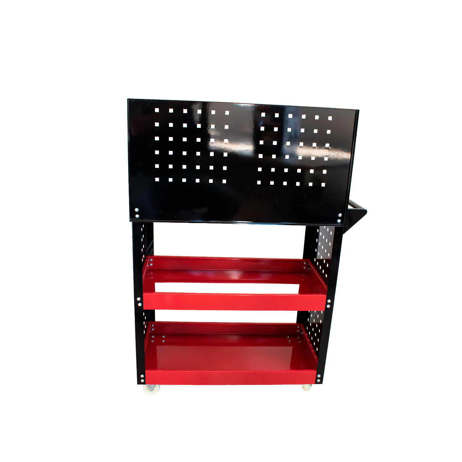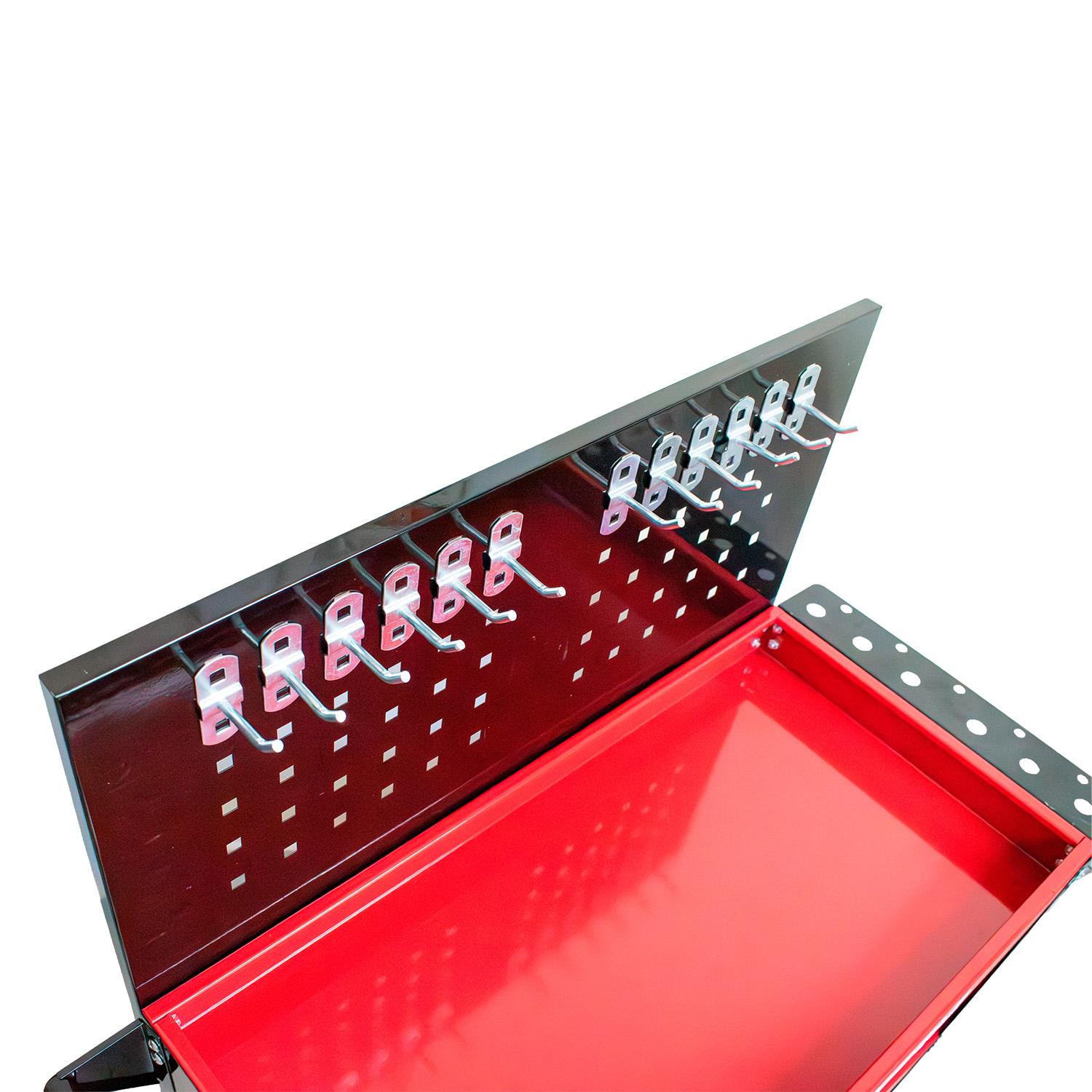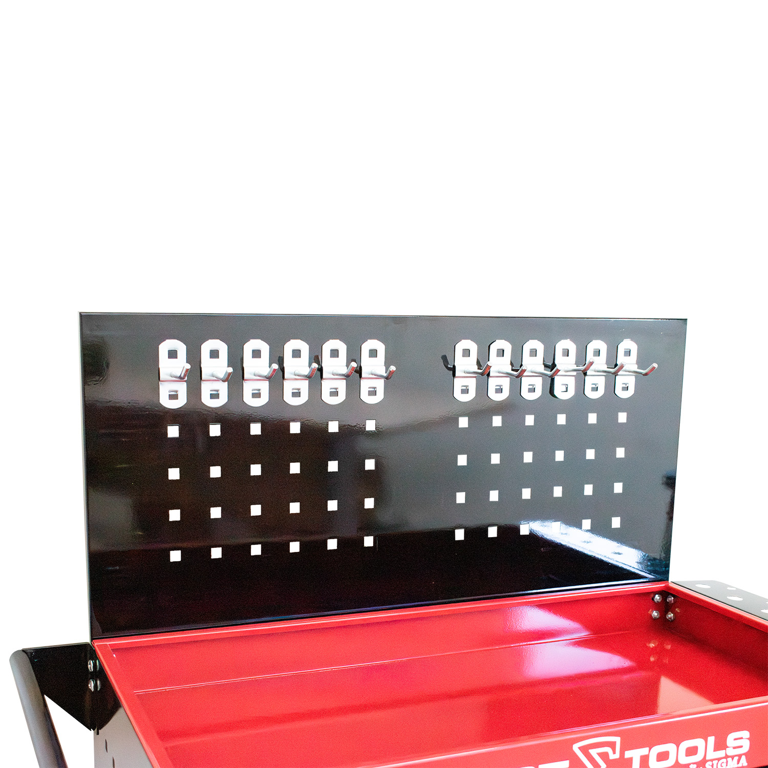 3 bandejas para organização de ferramentas; • Painéis laterais e traseiro para uso com ganchos; • Rodízios para fácil movimentação; • Alça para transporte; • Suporte para pinceis. Vantagens • Maior organização com uso combinado de bandejas e painéis; • Facilidade no acesso às ferramentas; • Mobilidade para uso em diferentes áreas da oficina; • Estrutura leve e resistente para uso profissional; • Acompanha 10 ganchos – 2001990001. Aplicação Ideal para organização e transporte de ferramentas em oficinas mecânicas, centros automotivos e ambientes de manutenção.